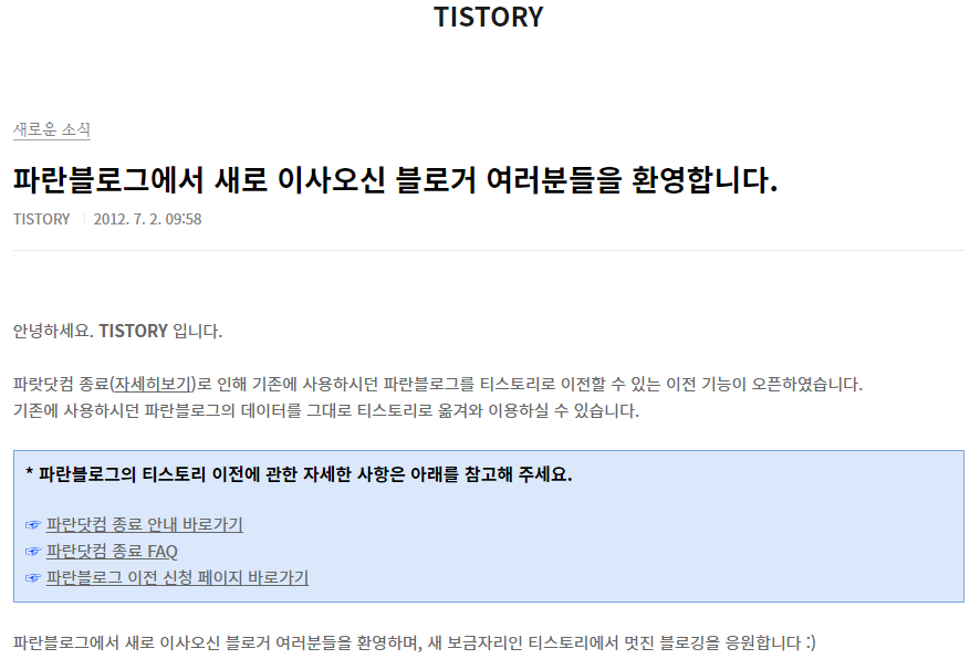 그런데, 2012년 경 파란닷컴이 서비스를 종료하게 되고, 이에 따라 파란닷컴의 블로그는 티스토리로 이전되었습니다.