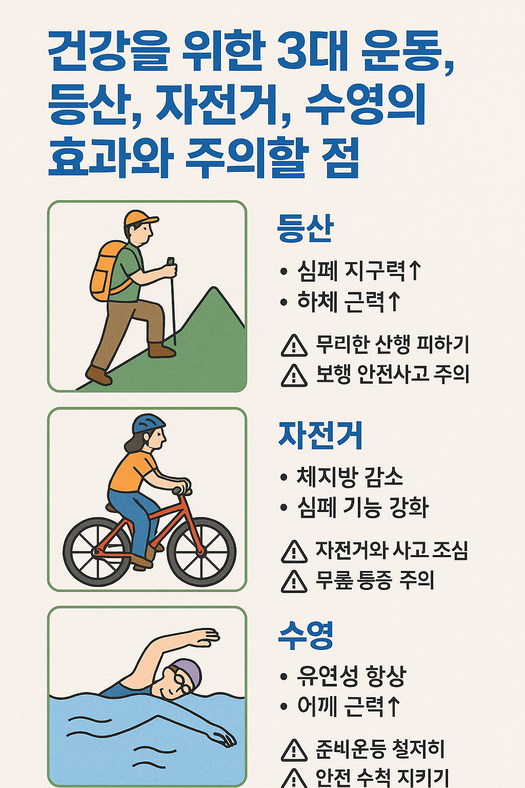 이번 글에서는 대표적인 세 가지 운동(등산, 자전거 타기, 수영)에 대해 알아보겠습니다.